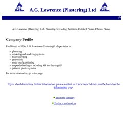 Aglawrence is ranked 5,616,038 in the United Kingdom. 'A.G. Lawrence (Plastering) Ltd - Plastering, Screeding, Partitions, Polished Plaster, Fibrous Plaster.'